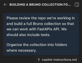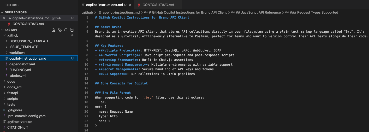 First, we'll clone FastAPIs repo, https://github.com/FastAPI/FastAPI, and add .github/copilot-instructions.md with with the Bruno instructions.