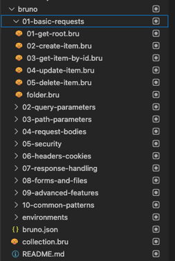 Just like that, Copilot has created a `bruno` folder inside the codebase with a full collection, organized nicely into folders based on category.