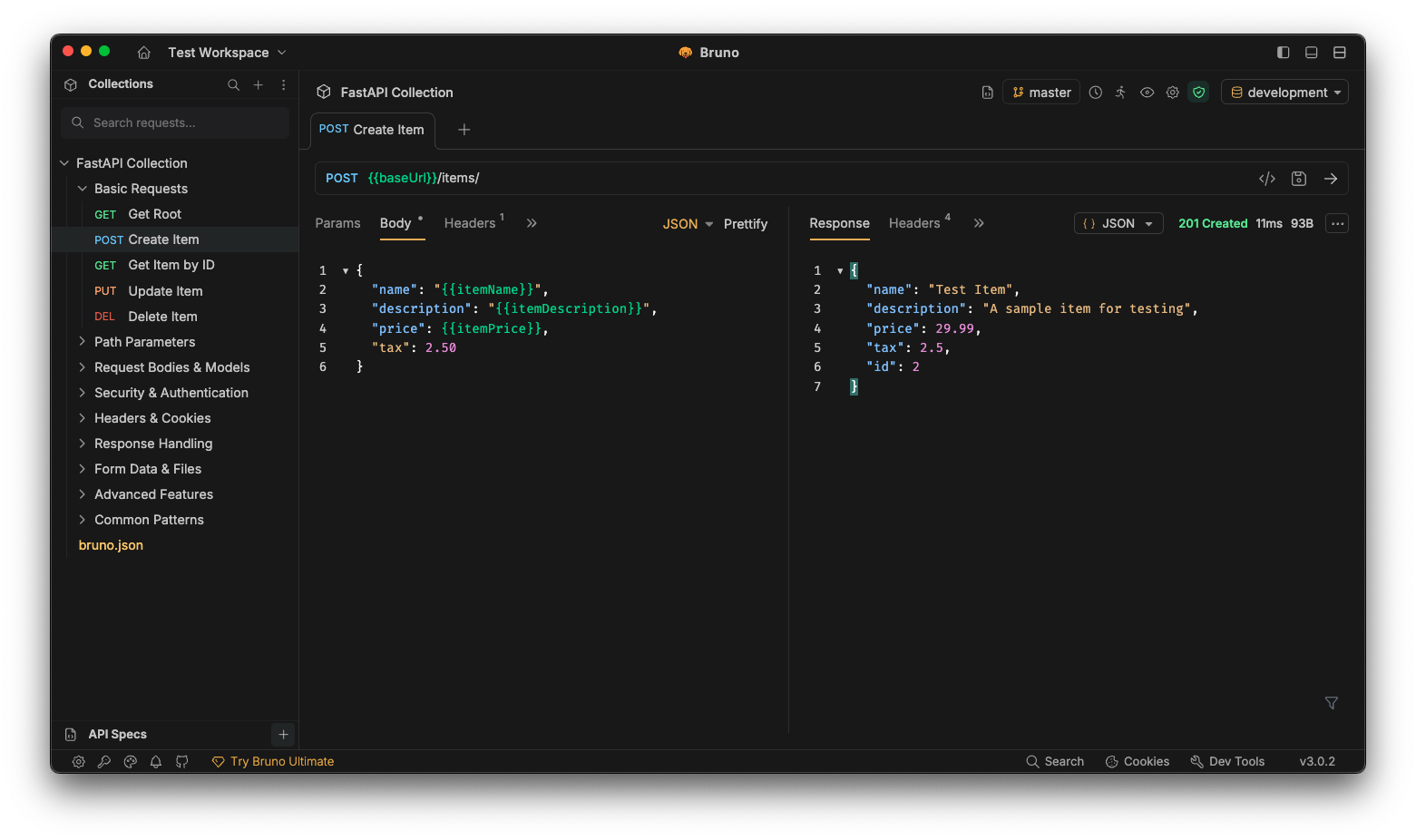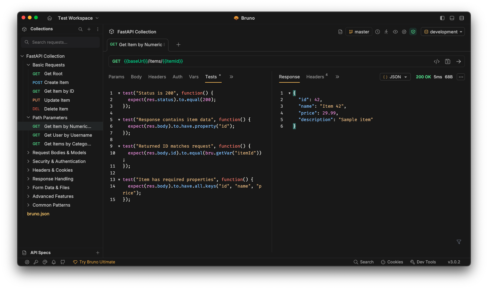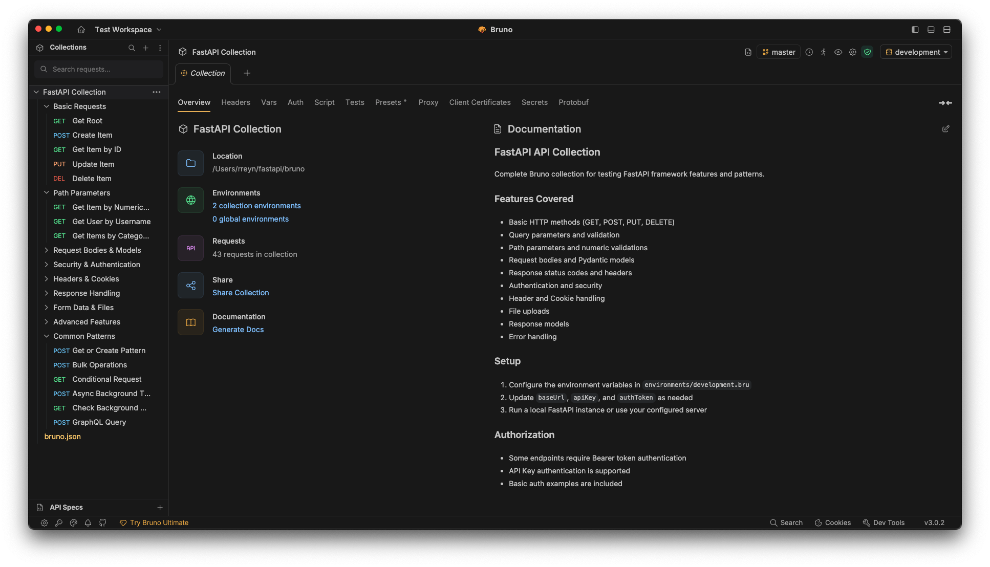 The full collection is now available in Bruno! I also asked Copilot to create a simple test server so we're able to hit the endpoints in the collection.