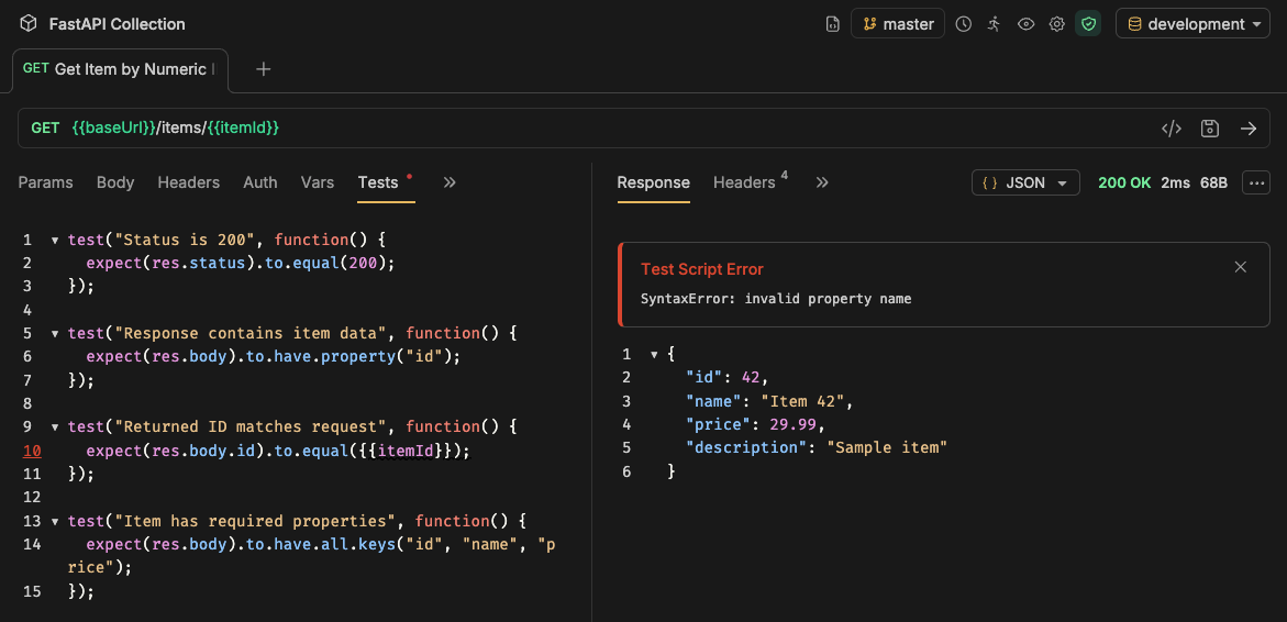 ,) don't match the current test data—exactly the kind of issue you'd want to catch before production. - ID Mismatches: The auto-incrementing IDs reveal state management issues between test runs. In a real CI/CD pipeline, this would tell you to reset your test database.