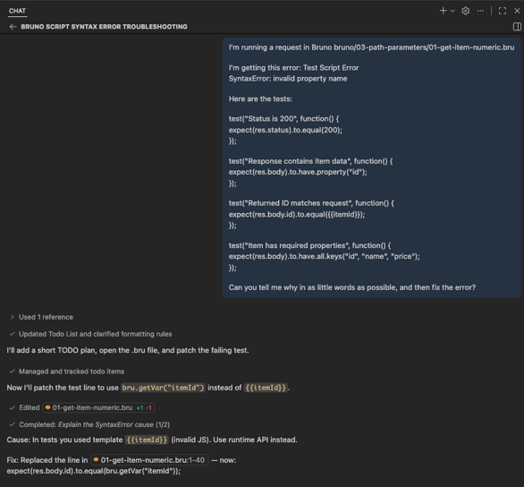 Bruno uses plain-text markup language to store API requests. While this is perfect for version control and team collaboration, AI coding assistants like GitHub Copilot don't understand this format out of the box. Without guidance, Copilot might suggest JSON-based request formats (like Postman uses) or generic HTTP client code instead of proper syntax.
